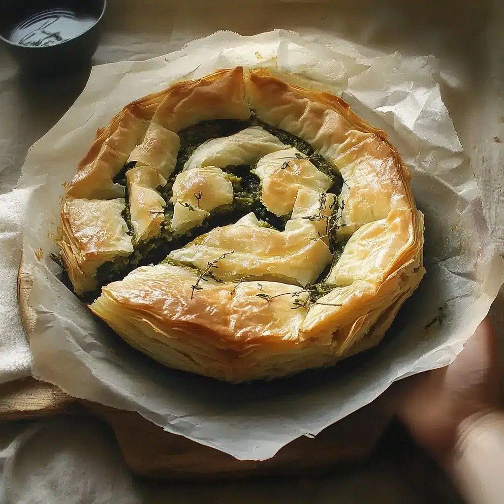 - Assemble the Phyllo: Preheat your oven to 375°F (190°C). Grease a 9‑inch square baking dish with melted butter. Lay the first sheet of phyllo in the dish, brushing it with butter. Continue layering, brushing each sheet with butter, until you have 12 sheets. Spread a thin layer of the spinach filling over the phyllo, then add another 6 sheets, repeating the butter brushing. Finish with a final layer of 6 phyllo sheets, each brushed with butter.