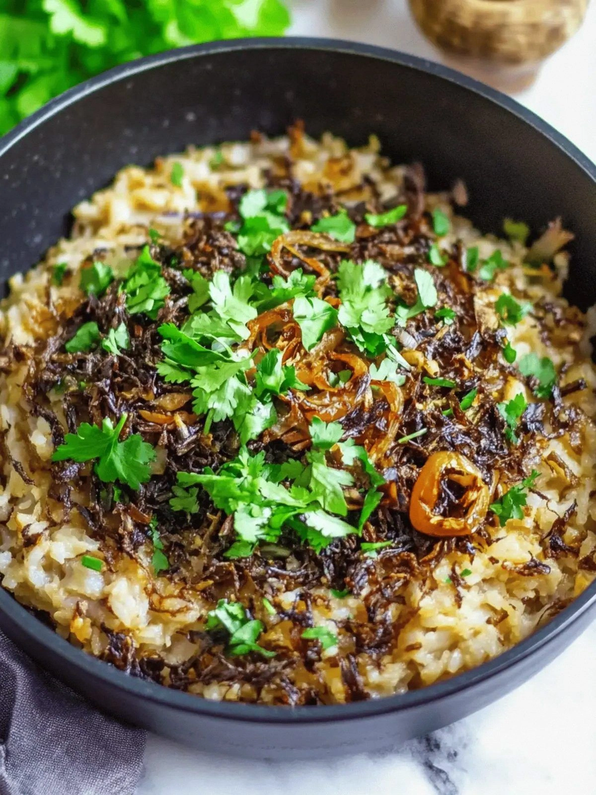 This recipe is a playground. Here are some of my favorite ways to switch things up: Spicy Mujadara – add a pinch of cayenne pepper or a splash of harissa for heat. Herb-Infused Version – replace parsley with fresh mint or basil for a different herbal profile. Vegan Twist – use vegetable broth instead of water for extra flavor. Protein Boost – stir in cooked chickpeas or diced tofu for a protein punch. Nutty Crunch – top with toasted almonds or pine nuts for a satisfying crunch.